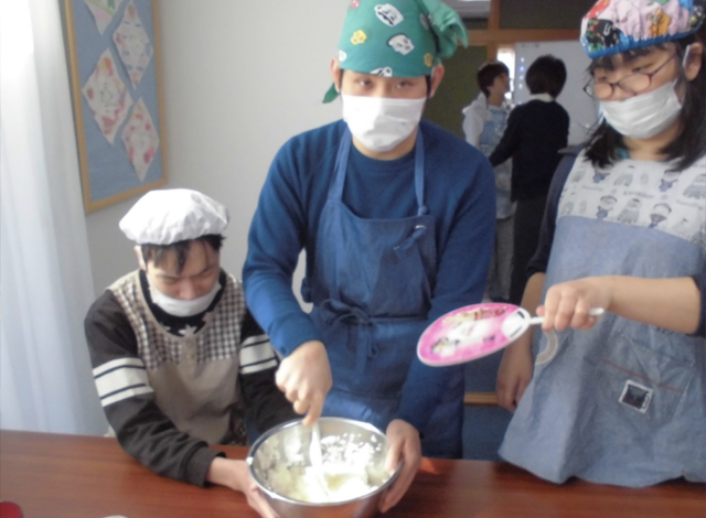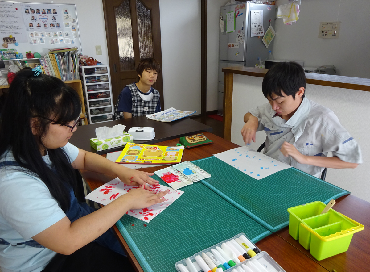一般の民家をお借りし、アットフォームな雰囲気で、入浴・排泄・食事の支援をしながら、生活に必要な活動(文字や絵の練習、調理、縫製等)を行い、生活していく上で必要な事を身につけられる活動を行っています。